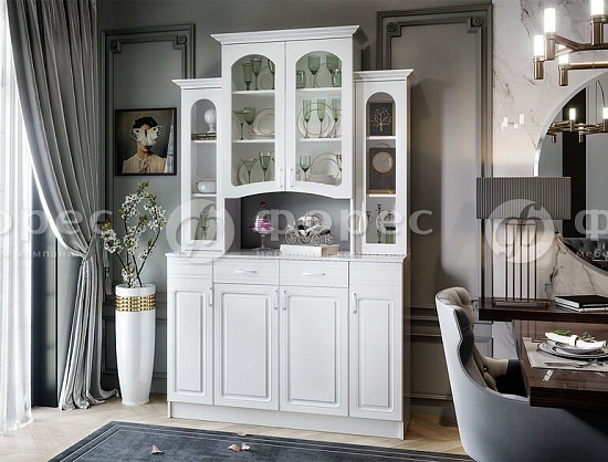 Изысканный буфет станет изюминкой любого интерьера! Модель очень вместительная, оборудована небольшими выдвижными ящиками и полками с глухими и стеклянными дверцами с ручками-скобами. Идеально для хранения посуды и кухонной утвари. Стекло в верхней части фасада делает конструкцию легкой и совершенно не громоздкой, несмотря на габариты.